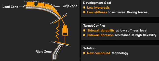 The sidewall of a tyre influences many aspects of a tyres performance, from how it feels on the road, the comfort of the tyre, how much road rumble is transmitted to the cabin and the fuel used. The compromise between steering feel and comfort is a difficult one to balance, but to help balance this Continental heavily worked on the belt edge and the shoulder area to significantly lower rolling resistance. Continental also managed to make the sidewall more flexible than before to increase comfort, but reinforced the bead area to maintain handling accuracy.