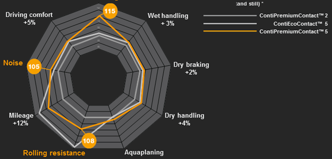 While certain manufacturers with limited resources might concentrate on the 3 label criteria, premium manufacturers like Continental have to design their tyres to excel in every category. The new Continental Premium Contact 5 does just that, by not only improving in the 3 label criteria, but also many other areas tested when compared to the Continental Premium Contact 2 (there was no Premium Contact 3 or 4!)