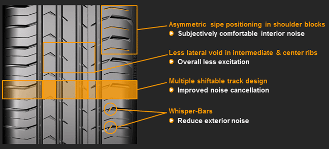 While many people believe the tread pattern influences grip, it’s main purpose is to evacuate water in wet conditions. To do this, tyre manufacturers cut grooves in the tread, which increase rolling resistance and noise. Continental have minimised these losses, using several clever technologies described below.