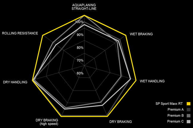 All the above technologies sound promising, but the real test of a tyre comes from benchmarking it against your leading competition.For this very reason Dunlop handed over the Sport Maxx RT to the independent German testing group TUV to test against 3 of its premium rivals. In 225/45 R17 on VW Golfs, the Dunlop was tested against the Bridgestone S001 (A), Continental Sport Contact 3 (B) and the Pirelli P Zero (C). When compared to the average of the three competitors, the Dunlop scored favourably in every category, offering 3.5 meters shorter dry braking, 2.3 meters shorter in the wet, 4.6 seconds faster around a 1 mile wet handling circuit and 11% less rolling resistance.