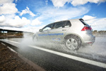 During the curved aquaplaning tests we drove two VW Golfs in a constant radius at 80kph and entered an area of 8mm water depth. Without changing the steering inputs, lasers measured the lateral deviation of the car caused by aquaplaning. The Goodyear averaged 3.4 meters over 20 runs, while the Michelin drifted a further 1.2 meters, averaging 4.6 meters.