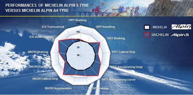 The left one should be ICE Braking :) instead of Snow braking. No I do not work for Michelin ... but I need 4x new Alpine 5 or Goodyear UG 9 or Nokian WR3. Interesting if Michelin was able to keep the good wear resistance with new products.