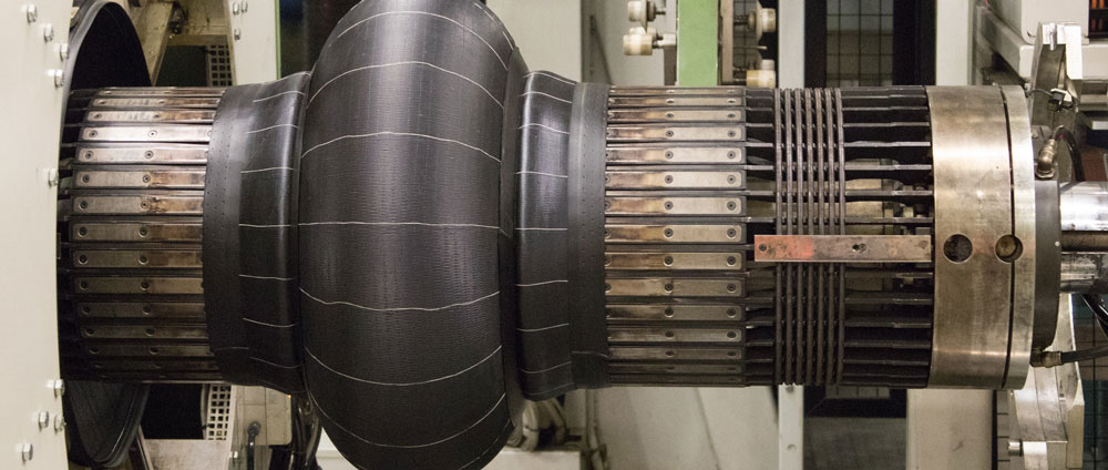 The main structure of the tyre tread is laid with two layers of steel cords, cut to length, and pressed back together at opposing angles for increased strength.