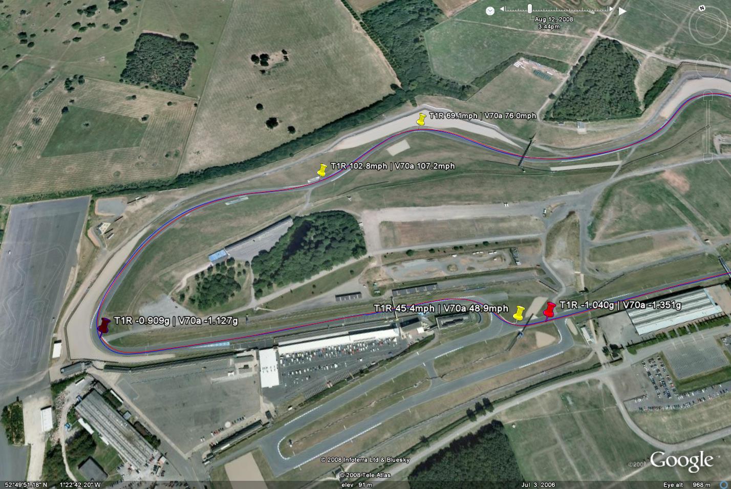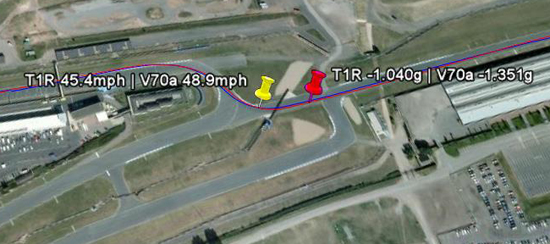 This is the second teaser we've published for this road vs track tyre report, but instead of just a pretty photograph this time we actually reveal some of the data we collected.The venue, Donington Park in Derby. The contenders - the Kumho V70a and the Toyo T1R. As promised we won't go into too much detail this time, but check out this lovely overlay from google earth showing apex speeds and G readings on each of the tyres.
