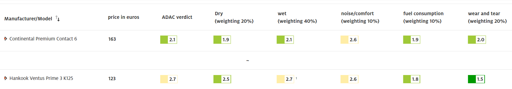 Sadly, as usual there's no actual data provided behind the scores, but ADAC have graded and commented on all the tyres in detail which you can read below.