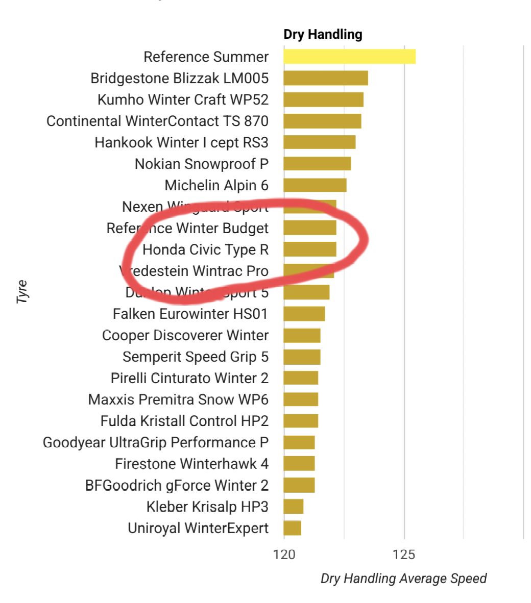 Dry handling was also led by the summer tyre, with the Bridgestone again the best of the winter tyres.