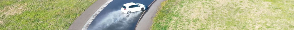 For curved aquaplaning, I use a circular track, typically around 100 metres in diameter, with a flooded arc of controlled water depth, usually about 7 mm. The vehicle is instrumented with GPS telemetry and a tri-axial accelerometer. I drive through the flooded section at progressively increasing speed, typically in 5 km/h increments, and record the minimum sustained lateral acceleration at each step. The test continues until lateral acceleration collapses, indicating complete aquaplaning. The result is expressed as remaining lateral acceleration in m/s² as speed rises.