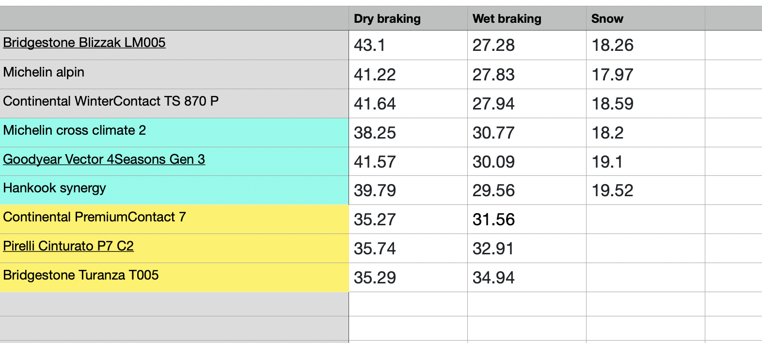 Interesting to see the Hankook Prime 4 have a massive win in the aquaplaning test when it always struggles quite behind the best in summer tyre tests, and doesn´t even have a great tread depth compared to the winter and all season tyres in this test. I've always thought winter and all season tyres had a lot more aquaplaning resistance. Another good reason to change tyres when the winter season is over.